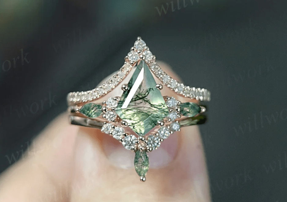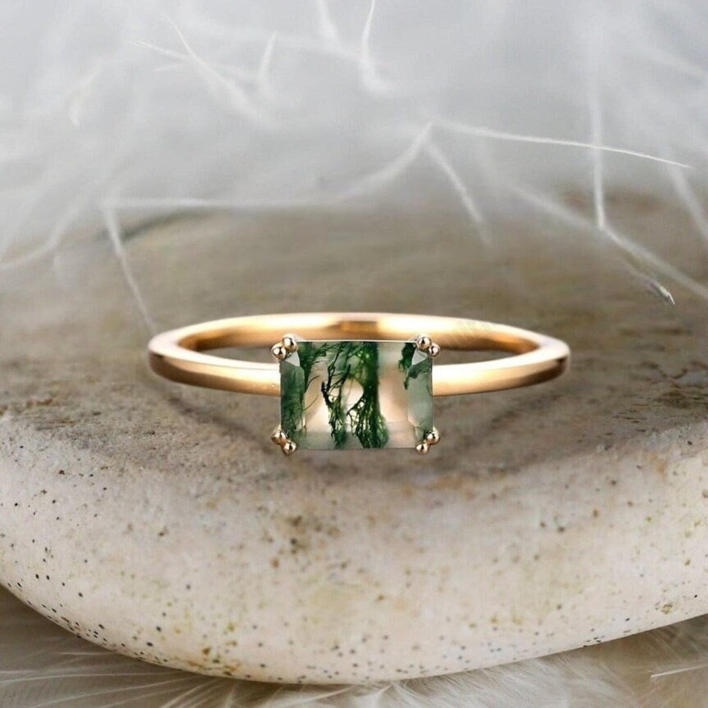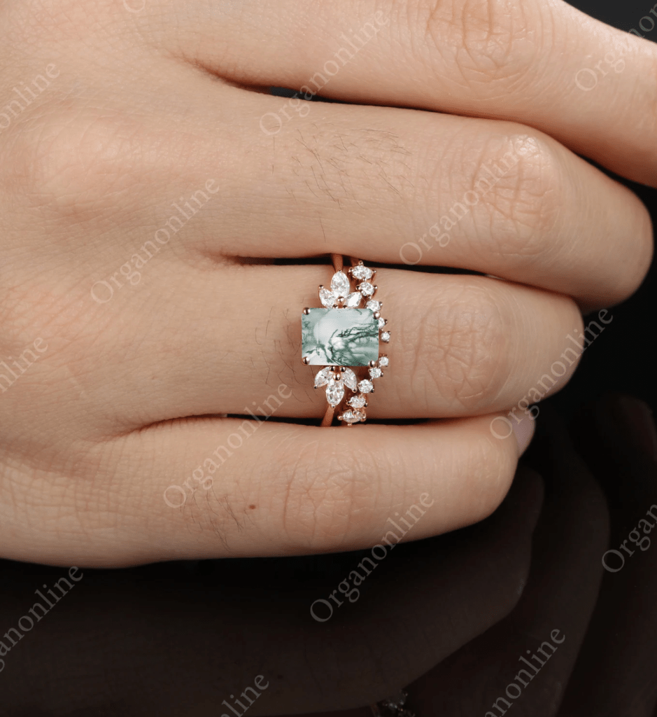 Here are some of our favorite moss agate engagement rings we have found.
