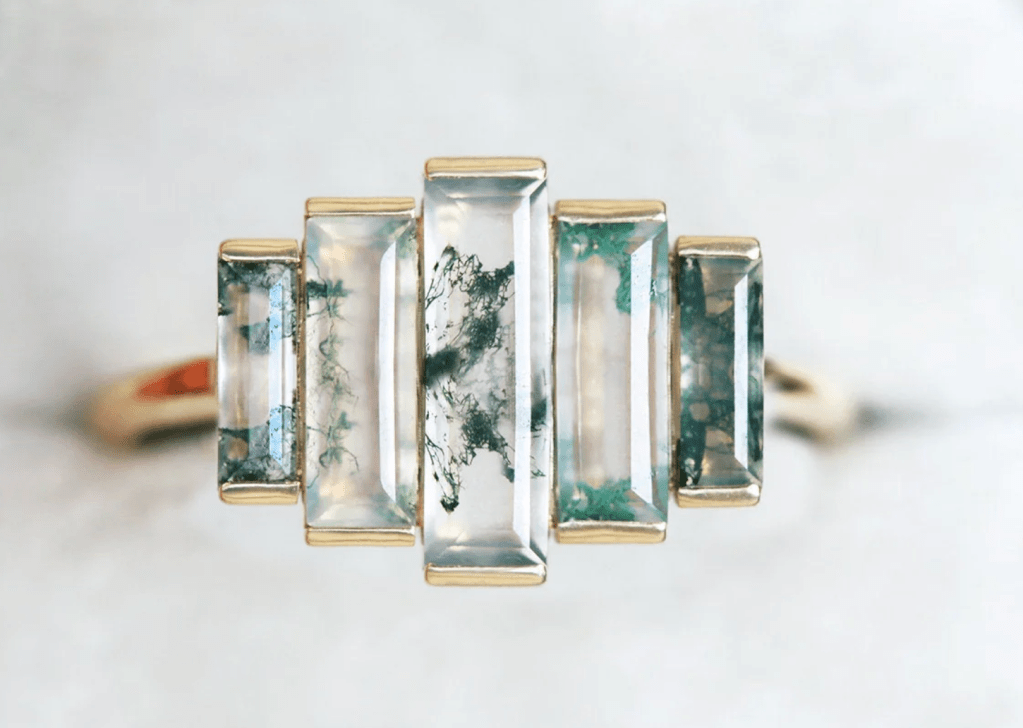 This gorgeous channel set moss agate baguette we found on Capucinne is an art deco fantasy: